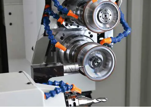 如果四刀刃钨钢铣刀端面前部没有圆槽,就需要用砂轮的圆角或在砂轮切割机上,沿铣刀的十字的螺旋槽方向重开十字槽,深度 1~2mm左右(太深易崩裂,太浅不易磨出副后角)。开槽时注意砂轮侧面不要碰到下面的另一个切削 刃口(注:此十字槽有排屑作用,如不开,则向中间凹进去的刃倾角要加大一些)。